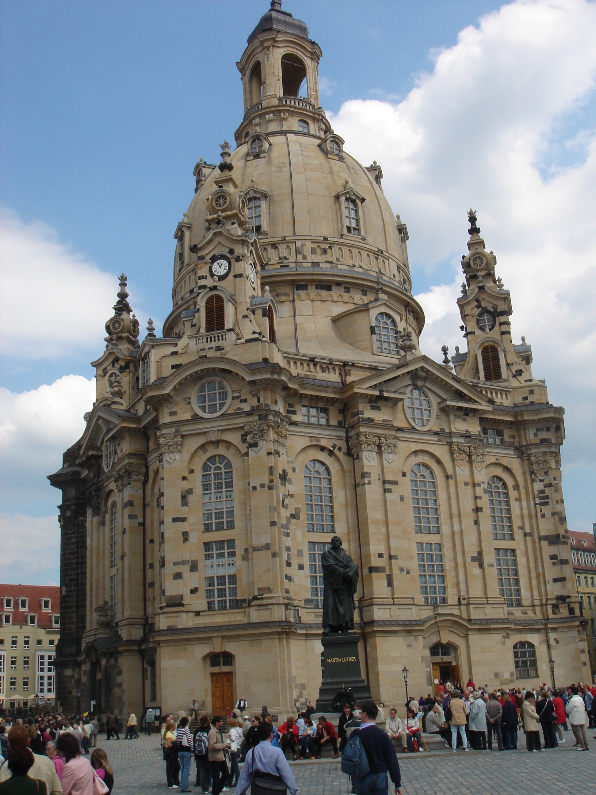 Großes Gedränge herrschte trotz äußerst unangenehmen Wetters vor der Frauenkirche. Am Eingang „C“ für organisierte Sonderführungen wurde unserer Gruppe noch relativ schnell Eintritt in die Kirche gewährt. Führer geleiteten uns in die oberen Gebetskammern des Gotteshauses, mit einem guten Überblick auf das Innere des großen Rundbaus, einem Meisterwerk handwerklicher Kunst. Das galt schon für ihre ursprüngliche Errichtung durch die Baumeister George Bär und Johann Georg Schmidt, dass aber aus dem Trümmerhaufen nach Bombardement und Feuersbrunst ein in allen Einzelheiten neues Original geschaffen wurde, ist fasst unglaublich.